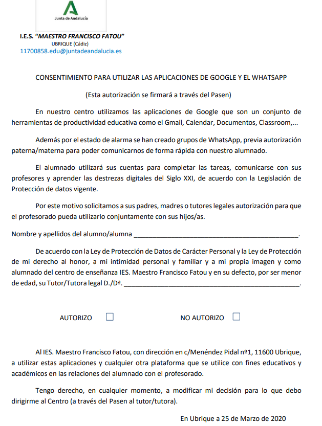 Está disponible en iPasen la autorizació nque los padres deben firmar para que se pueda usar la suite de Google y Whatsapp con fines educativos.